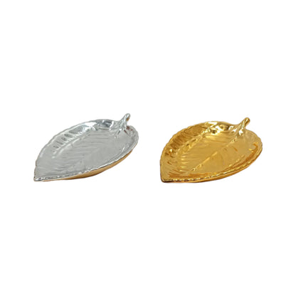 Añade un toque de naturaleza y elegancia a tu hogar con esta hermosa bandeja decorativa en forma de hoja. Diseñada con un exquisito acabado, esta pieza combina el brillo del metal plateado y dorado para crear un efecto visual cautivador.