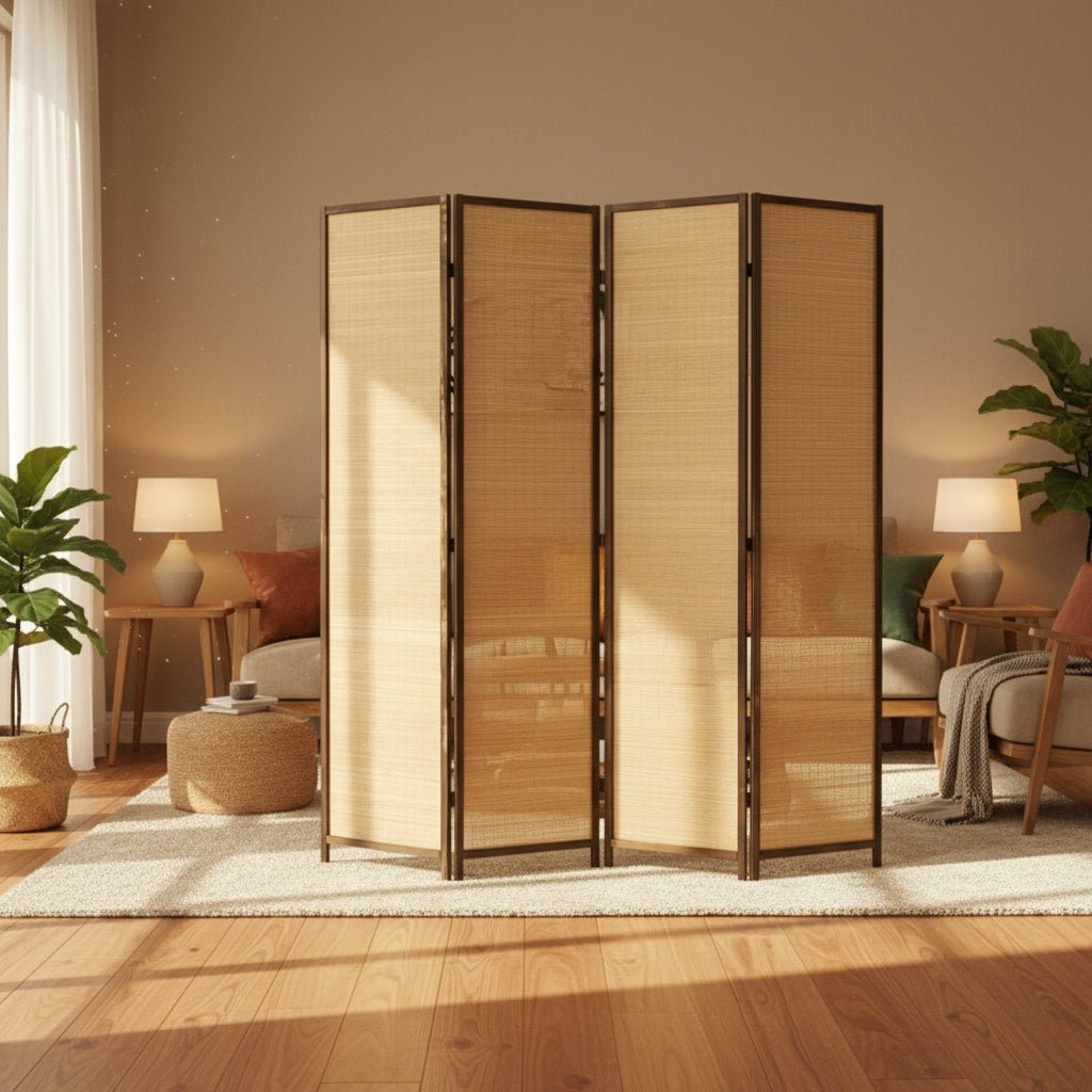 Dale un toque de estilo y funcionalidad a tu hogar con nuestro elegante biombo divisor de ambientes de bambú. Con sus generosas medidas de 1,80cm de alto y 1,80 m de ancho, este biombo de 4 paneles de 45cm cada uno es la solución perfecta para crear espacios definidos o añadir un elemento decorativo único.
