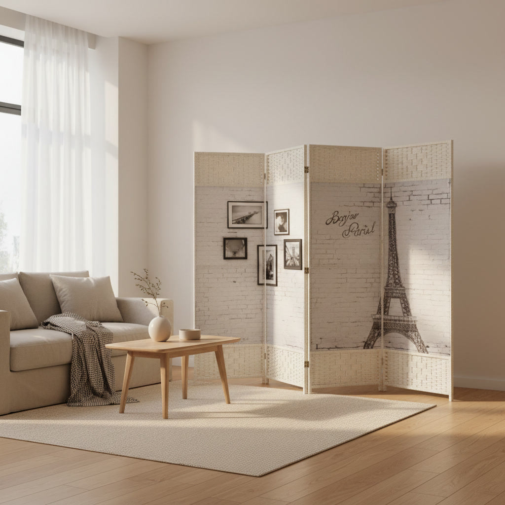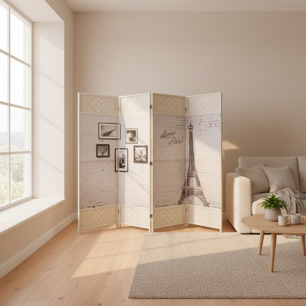 Biombo decorativo de cuatro paneles con elegante diseño inspirado en París, que combina ilustración de la Torre Eiffel y detalles tipo galería fotográfica sobre fondo estilo ladrillo blanco. Su estructura en tono claro con acabado tejido aporta textura y calidez, convirtiéndolo en una pieza sofisticada y funcional. Ideal para dividir ambientes, crear un rincón íntimo o añadir un toque romántico y urbano a living, dormitorio u oficina.