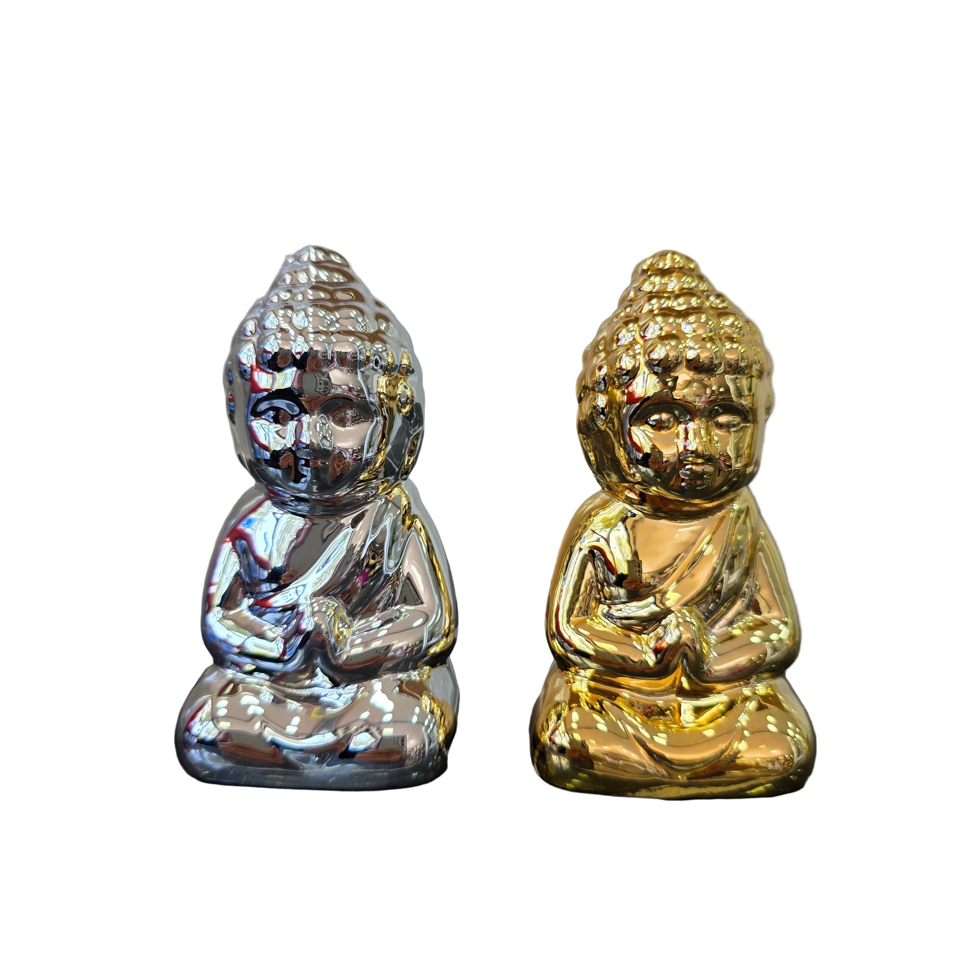 Estas hermosas figuras de Buda son el complemento perfecto para cualquier espacio de meditación o decoración zen. Disponibles en dos elegantes acabados, plateado y dorado, estas piezas destacan por su diseño detallado y su brillante superficie.