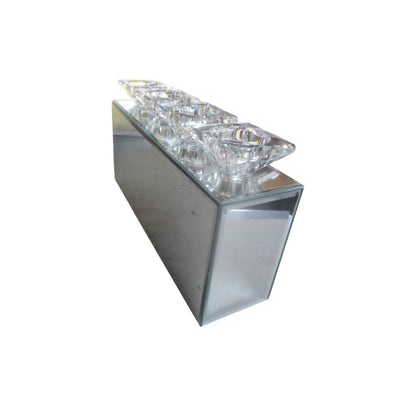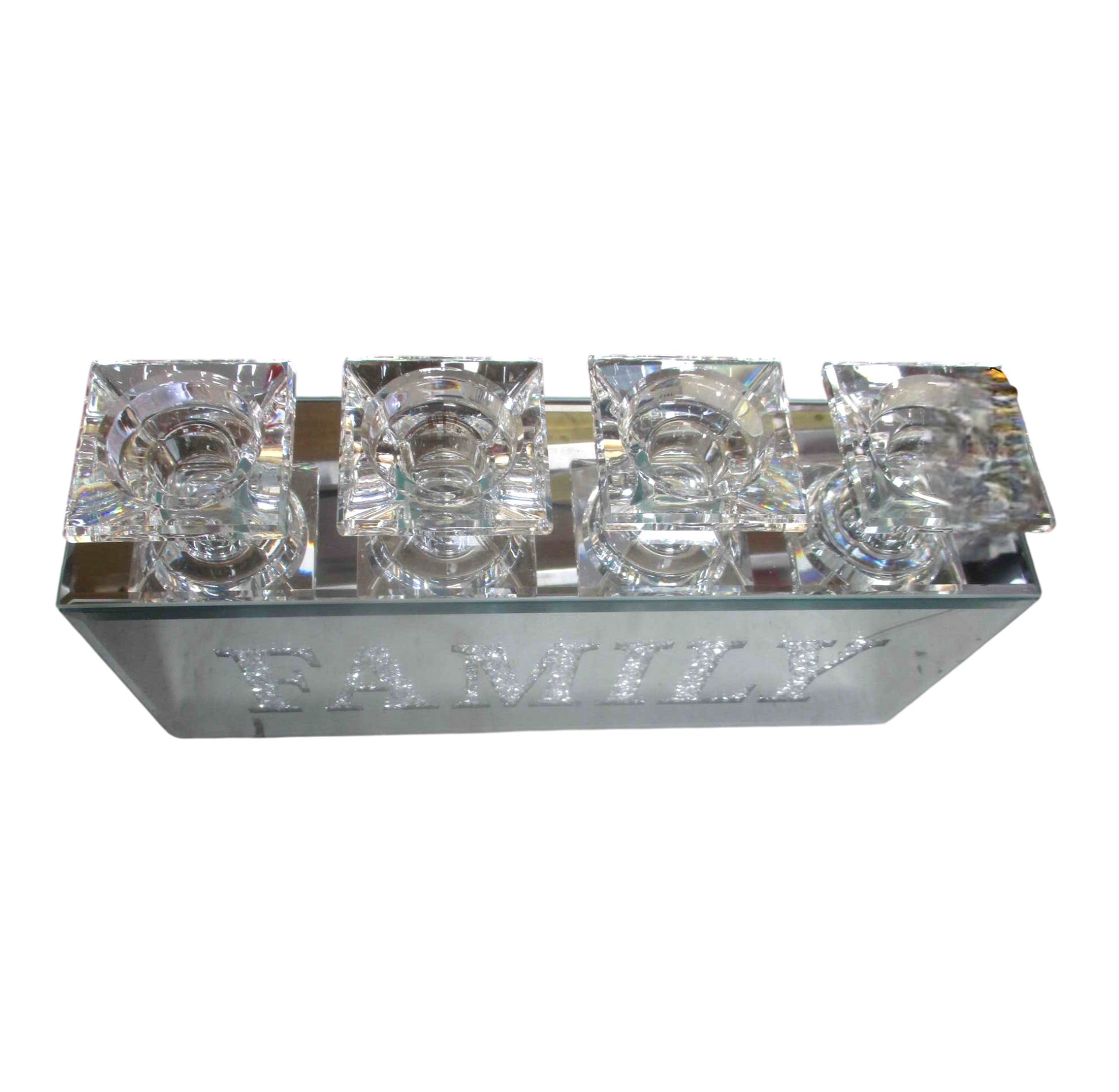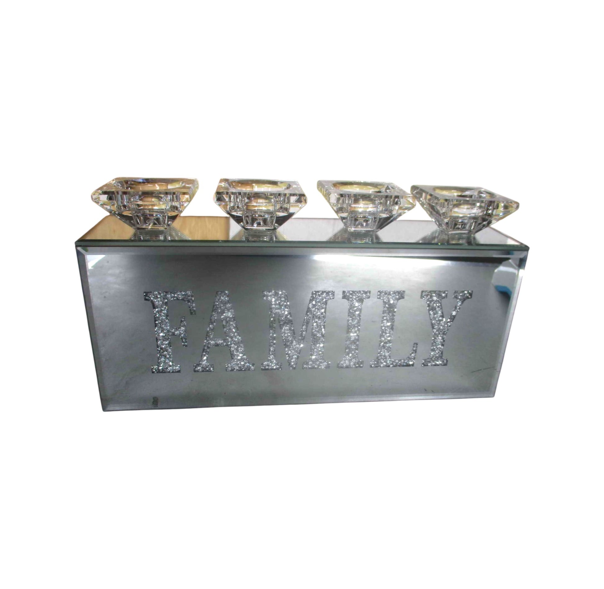 Su estructura rectangular con acabado espejo refleja la luz de manera sutil y refinada, mientras que las cuatro bases en forma de diamante ofrecen un soporte exclusivo para velas tipo tealight o LED. El texto “FAMILY” en glitter destaca con un brillo encantador, convirtiéndolo en un elemento perfecto para cualquier sala, comedor, entrada o rincón especial.