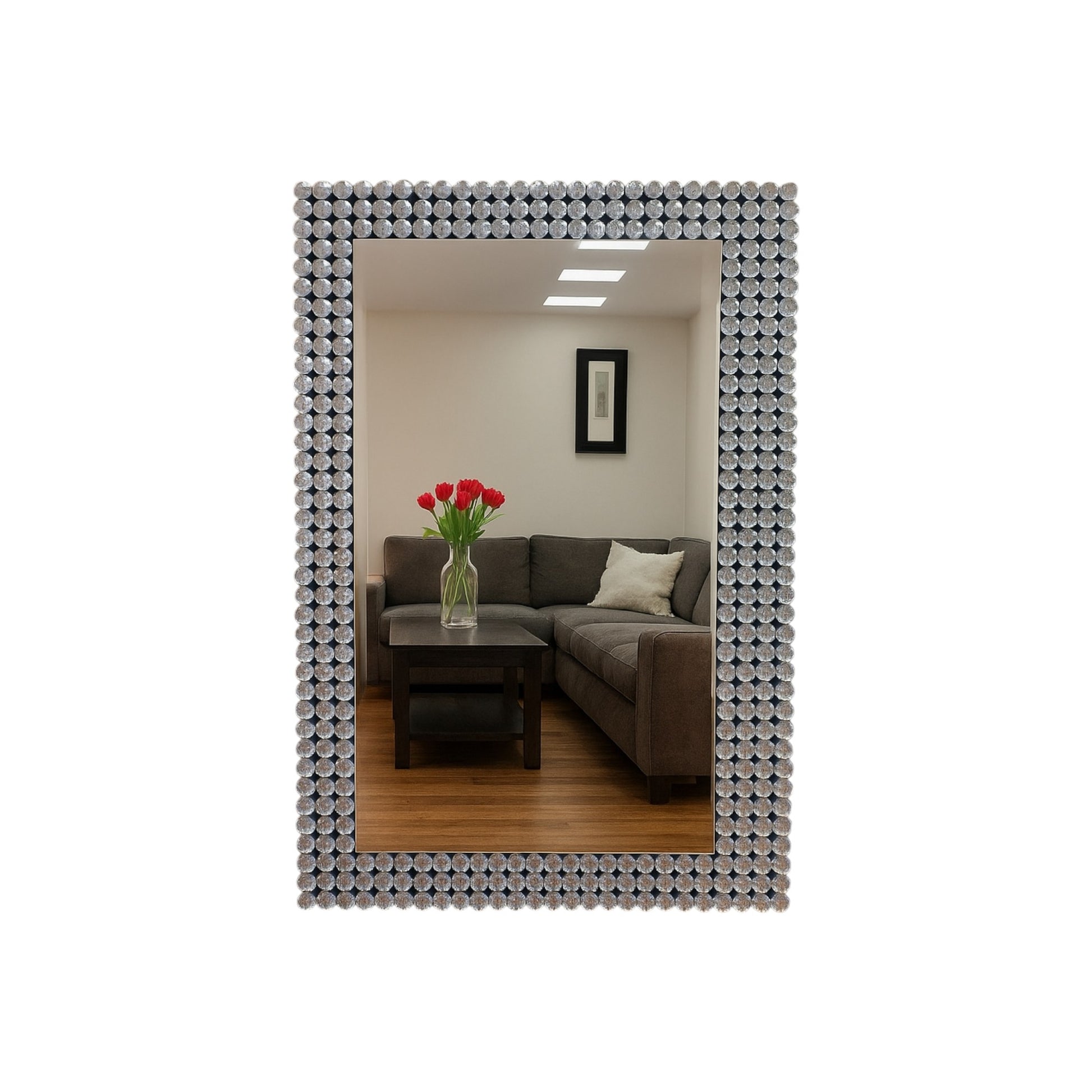 Eleva la elegancia y el estilo de cualquier espacio con este espectacular espejo de pared. El marco está decorado con cientos de brillantes cristales que reflejan la luz de manera deslumbrante, creando un efecto cautivador.