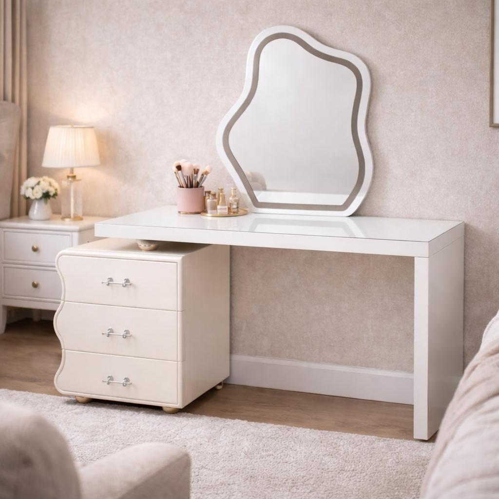 Tocador de diseño contemporáneo ideal para dormitorios modernos. Cuenta con amplia superficie superior, cajonera lateral de tres compartimentos con detalles decorativos y espejo de forma orgánica que aporta estilo y personalidad al espacio. Su estructura firme y acabado elegante lo convierten en una pieza funcional y decorativa, perfecta para maquillaje, organización y uso diario. Ideal para crear un rincón sofisticado y acogedor en tu habitación.