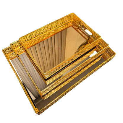 Eleva la decoración de tu espacio con este hermoso set de bandejas espejadas doradas. Úsalas como centro de mesa, en repisas o muebles para realzar la presencia de tus objetos favoritos.
