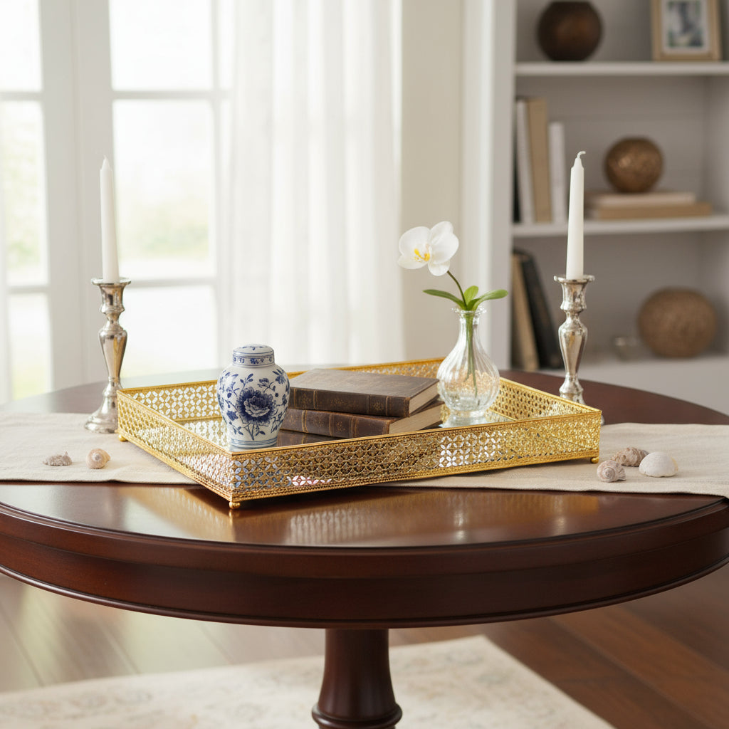 - Ideal para exhibir objetos decorativos, velas, flores o servir aperitivos