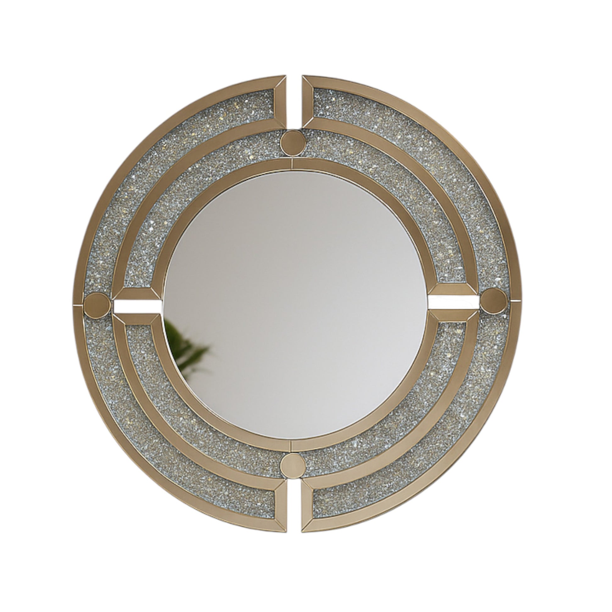 - Marco circular con detalles de cristal brillante que reflejan la luz de manera deslumbrante