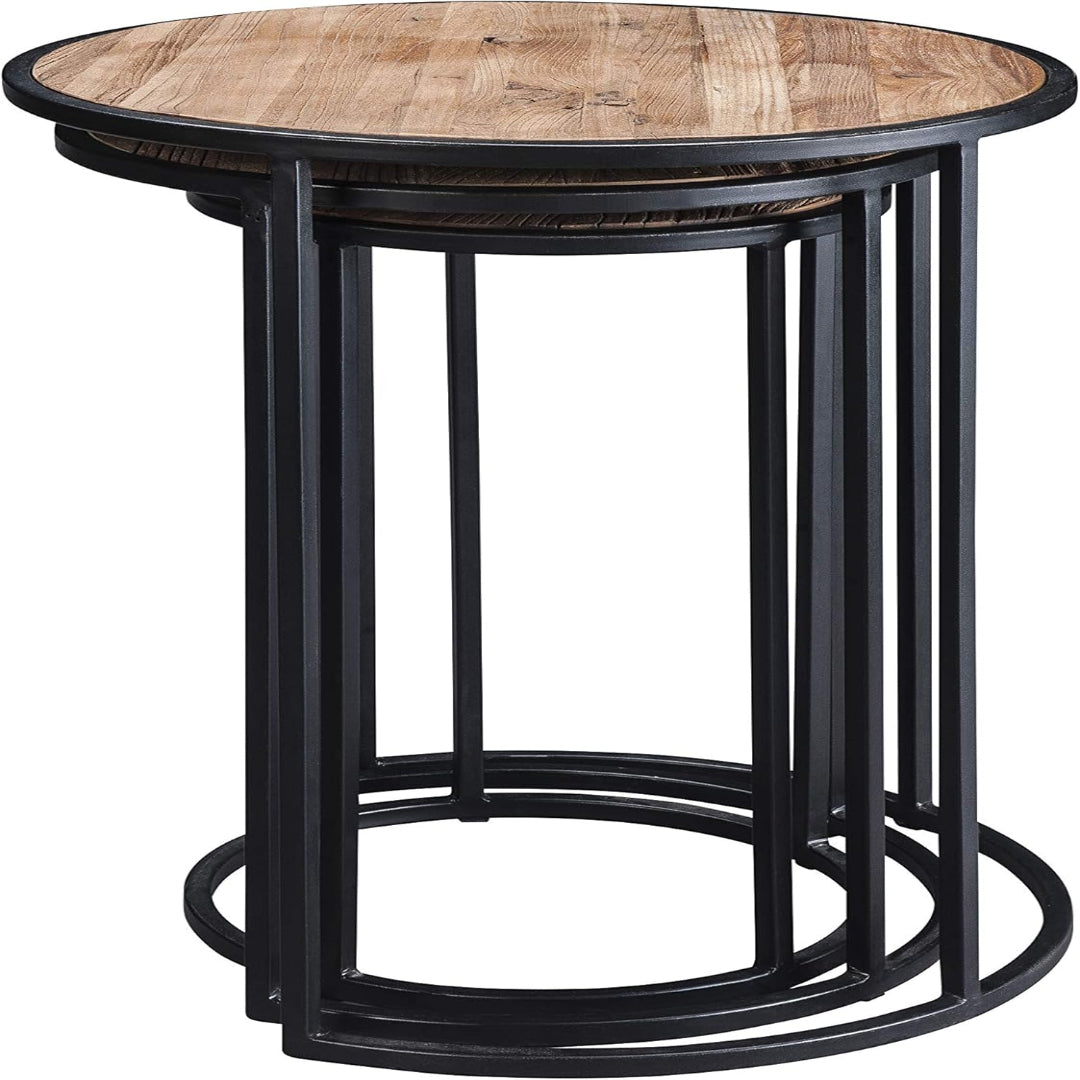 Cada mesa puede utilizarse de manera independiente o juntas, ofreciendo versatilidad para decorar y organizar objetos, libros o elementos decorativos. La robusta estructura metálica asegura durabilidad, mientras que el acabado en madera aporta armonía y elegancia visual.
